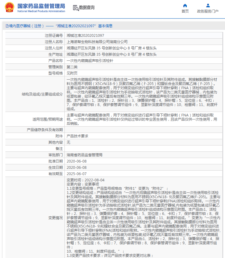 主要与超声内窥镜配套使用,用于对病变组织进行超声引导下细针穿刺(FNA)活检和组织取样。一次性内窥镜超声吸引活检针仅供经过培训的专业医生使用,且该产品仅供一次性使用,用后销毁。